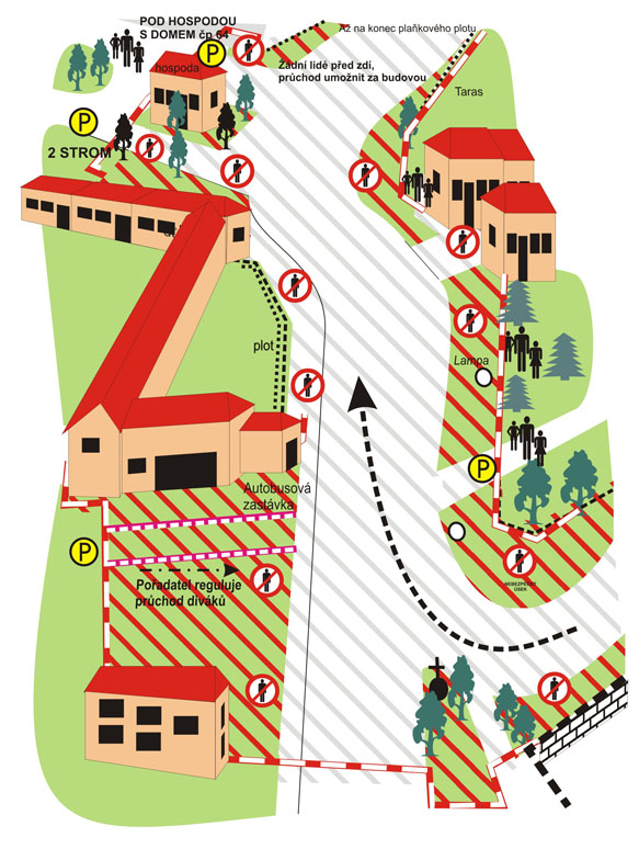 Průjezd obcí s rychlým odbočením z úzké účelové komunikace na hlavní silnici, objezdem místního kostela a umělým retardérem na konci obce. Příjezd od Českého Krumlova, parkování organizováno před obcí.
