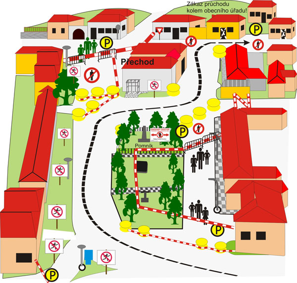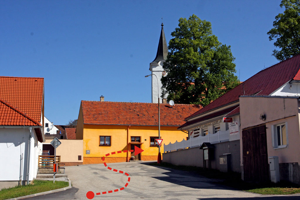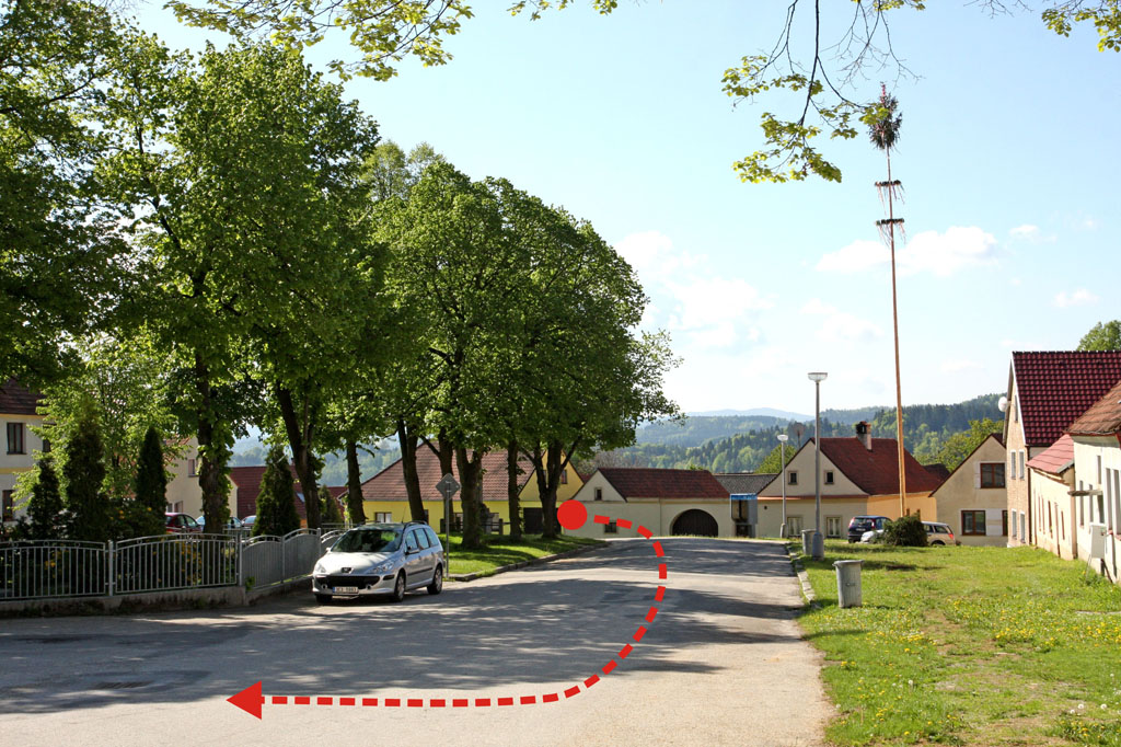 Technický průjezd soběnovskou návsí. Příjezd od Kaplice po silnici číslo 154 přes Blansko a po místní komunikaci do Soběnova.