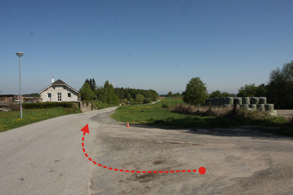 Průjezd zemědělským statkem v Soběnově a odbočení na hlavní silnici s výhledem na několik stovek metrů trati.