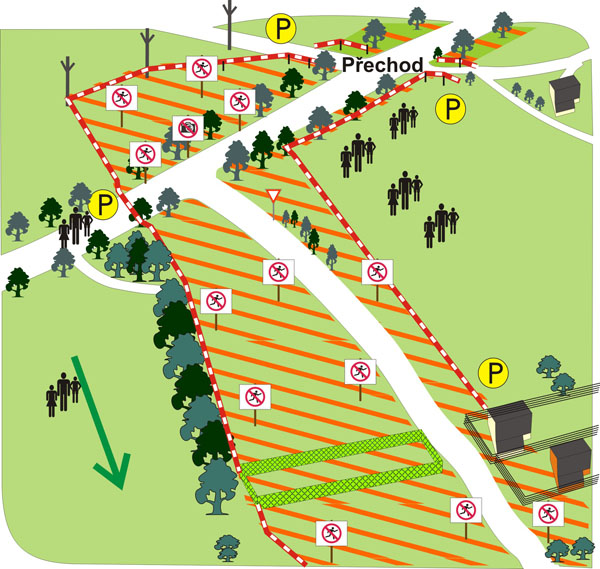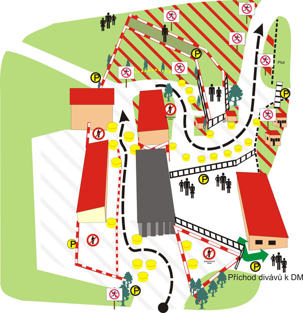 Přístup fanoušků do vnitřní části diváckého místa u zemědělských stavení (k váze) je pouze po příjezdu od Velešína, venkovní plochy jsou dostupné ve směru od Ločenic. Průchod přes trať rychlostní zkoušky je zakázán!