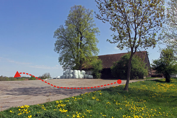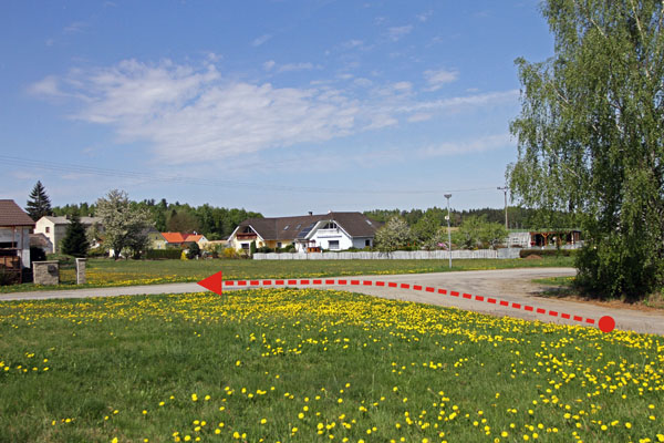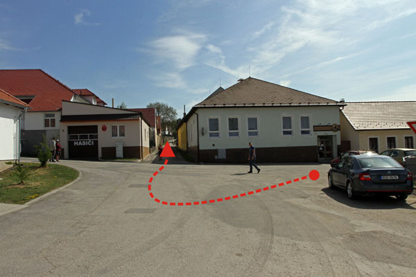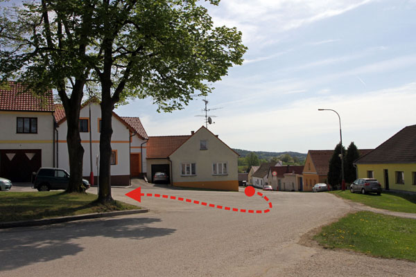 Zajímavé místo krátce před cílem s výhledem na cílovou zatáčku s výjezdem na širokou silnici z úzké účelové ze statku. Možnost přechodu na náves a ke stopce.