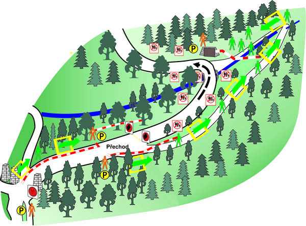 Parkování vozidel v Rožmberku nad Vltavou, přístup pěšky k časové kontrole a poté lesem na divácké místo.