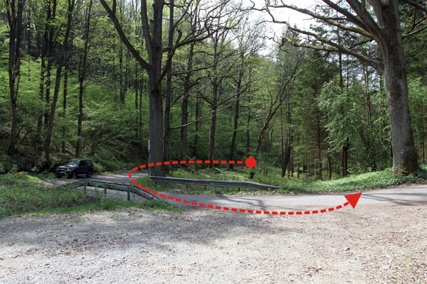 Spojení časové kontroly, startu rychlostní zkoušky a diváckého místa s levou zatáčkou přes mostek s následujícím výjezdem do kopce v aleji mohutných stromů.
